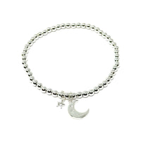 Experience some sparkle with this elegant silver plate beaded stretch bracelet featuring a gold, silver, or rose gold moon and star charms.